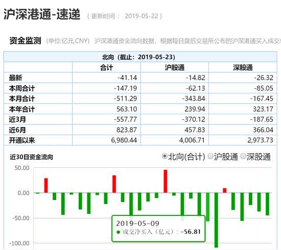 摘要: 5月23日消息,北向資金今日凈流出41億,其中,滬股通流出14.82億,深股通流出26.32億。另?yè)?jù)wind,本月今日以前已經(jīng)流出470億,也就是說(shuō)北向資金在5月已經(jīng)突破500億元,凈流出額度高達(dá)51