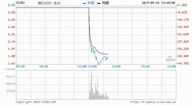 Mega Expo(01360)今午復(fù)牌,現(xiàn)跌25.08%,報(bào)2.21元,盤(pán)中低見(jiàn)1.6元,穿250天線(xiàn)(2.94元);成交約1083萬(wàn)股,涉資2386萬(wàn)元,主動(dòng)賣(mài)盤(pán)73%。