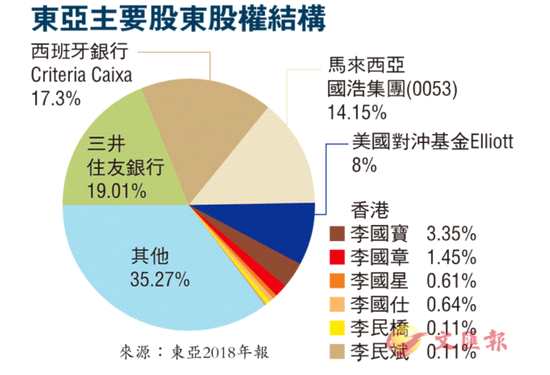 東亞銀行于1918年由現(xiàn)任主席李國(guó)寶的祖父李冠春與李子方、簡(jiǎn)東浦、周壽臣和馮平山等華商,于香港注冊(cè)成立,之后長(zhǎng)年由李氏家族掌控。但據(jù)東亞2018年年報(bào)顯示,東亞前四大股東分別是持19%股權(quán)的日本三井住友銀行、持17.3%的西班牙Criteria Caixa、持14.2%的國(guó)浩集團(tuán)(0053),以及占8%股權(quán)的美國(guó)對(duì)沖基金Elliott。