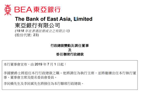 根據(jù)公司公告,李國(guó)寶在7月1日起將退任東亞銀行行政總裁,并調(diào)任為執(zhí)行主席,但會(huì)繼續(xù)出任該行執(zhí)行董事、董事會(huì)主席及提名委員會(huì)委員。東亞發(fā)言人表示,李國(guó)寶退任行政總裁后,將領(lǐng)導(dǎo)重要關(guān)系小組,主理與策略股東、伙伴及主要客戶的關(guān)系,不會(huì)參與銀行日常事務(wù)。