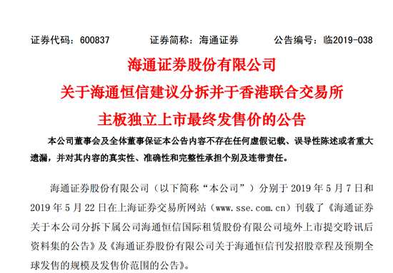 摘要: 海通證券(600837)公告稱,海通恒信H股股份最終發(fā)售價(jià)為每股1.88港元,如果全球發(fā)售按最終發(fā)售價(jià)每股1.88港元進(jìn)行,則緊隨全球發(fā)售完成后海通恒信的市值將約為154.82億港元(假設(shè)超額配股權(quán)未