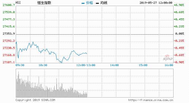 摘要: 5月27日消息,美股周五收高。但上周美股三大股指均錄得較大跌幅,其中道指錄得2011年以來的最長連續(xù)下跌周數(shù)。今日開盤,港股恒生指數(shù)低開0.42%,隨后在27200點(diǎn)上下震蕩。截止午間收盤,恒生指數(shù)跌