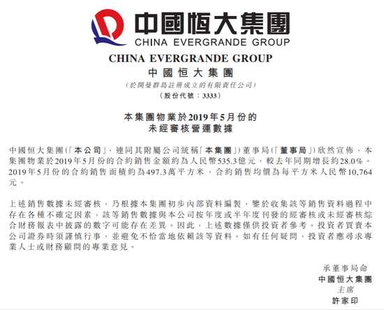 中國恒大:集團(tuán)物業(yè)5月份合約銷售金額約為535.3億元,同比增長(zhǎng)28%。2019年5月份的合約銷售面積約為497.3萬平方米,合約銷售均價(jià)為每平方米人民幣10,764元。