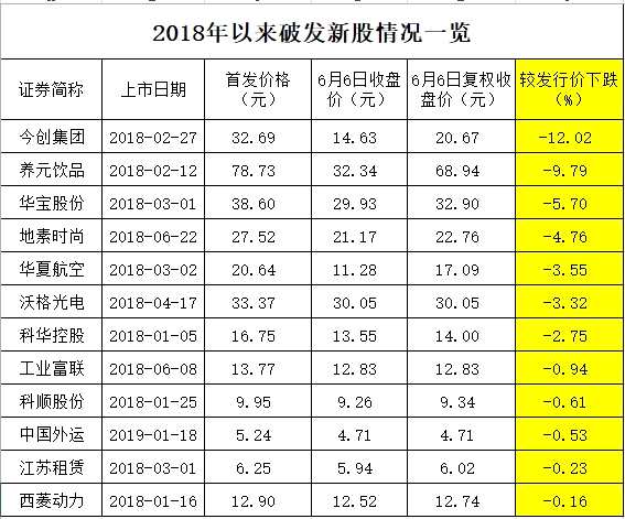 由于近年來(lái)市場(chǎng)整體低迷,2018年以來(lái)上市的新股,截至6月6日,按照后復(fù)權(quán)的股價(jià),已有不只10只破發(fā)。除了工業(yè)富聯(lián),今創(chuàng)集團(tuán)、養(yǎng)元飲品、華寶股份、地素時(shí)尚、華夏航空等已經(jīng)破發(fā)。