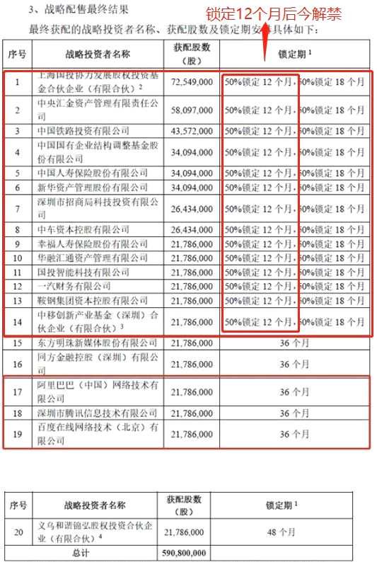 本次解禁的股票包括戰(zhàn)略配售中鎖定12個(gè)月的股份,另外還有18個(gè)月、36個(gè)月、48個(gè)月三檔的鎖定期?;ヂ?lián)網(wǎng)巨頭BAT各認(rèn)購(gòu)了3億元,鎖定期均為36個(gè)月,目前都被套。