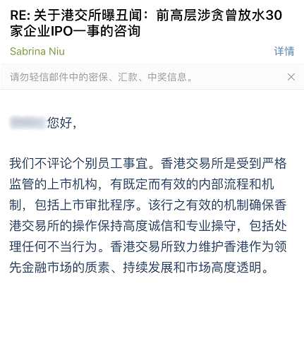 券商中國記者亦就此事給港交所方面發(fā)送了郵件,此后不久,即收到了回復(fù),香港交易所發(fā)言人回復(fù)中稱: