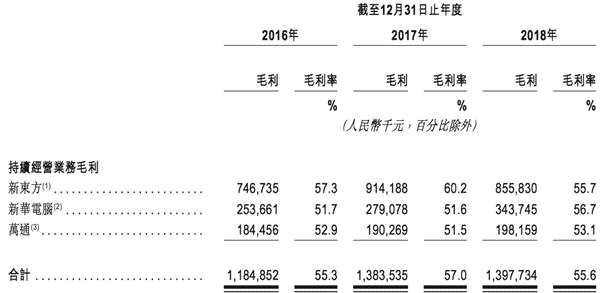 財務(wù)資料顯示,新東方烹飪、新華電腦、萬通三大板塊總體毛利率達到了55.6%。2018年,公司凈利潤為5.1億元。