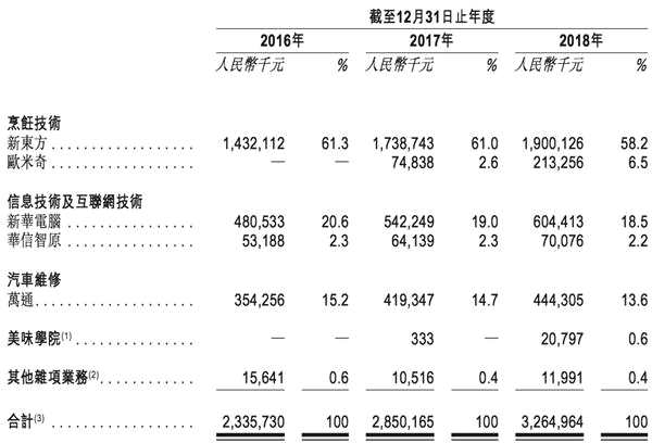 新東方烹飪只是中國東方教育一部分,但也是最重要的一部分。根據(jù)公司此前的上市材料,中國東方教育有三大業(yè)務(wù)板塊:烹飪技術(shù)、信息技術(shù)、汽車服務(wù)。截至2018年,中國東方教育在內(nèi)地29個省份及香港運營的學校達到了145所,其中,新東方烹飪50所、新華電腦教育23所、萬通汽車教育26所。