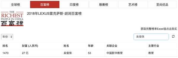 經(jīng)過十余年的發(fā)展,吳氏家族在安徽已是枝葉龐大。盡管新東方烹飪學校名聲在外,但低調(diào)的吳家到底有多少財富,一直是個未知數(shù)。隨著公司上市,吳俊保也開始出現(xiàn)在富豪榜上。去年,吳俊保因為中國新華教育上市,才首次進入了胡潤富豪榜,不過榜單上27億的身家僅為中國新華教育的持股財富。