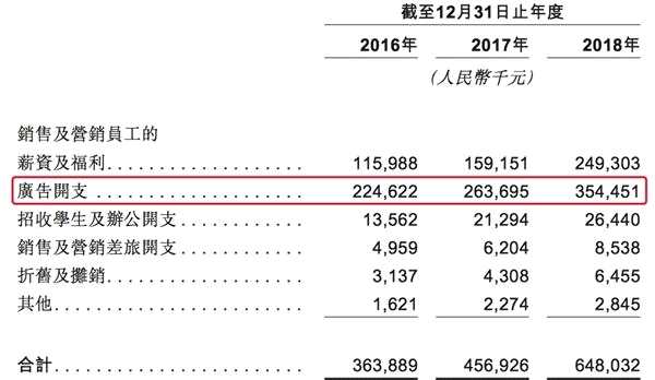 上市資料,2016年至2018年,中國東方教育的廣告開支分別為2.24億元、2.63億元、3.54億元。在2018年,平均每天的廣告支出達到97萬元。