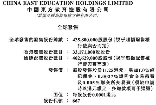 去年12月6日,中國東方教育向港交所遞交IPO申請資料。昨天(6月11日),中國東方教育發(fā)布公告稱,公司擬發(fā)行4.358億股,發(fā)售價已定為每股11.25港元。