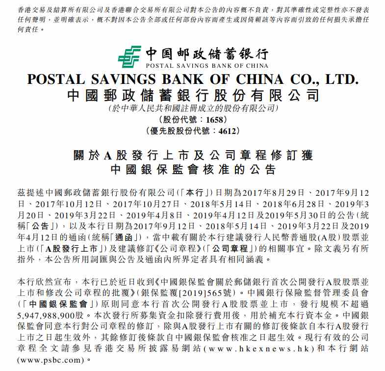 郵儲(chǔ)銀行:銀保監(jiān)會(huì)原則同意首次公開(kāi)發(fā)行A股 規(guī)模不超59.48億股