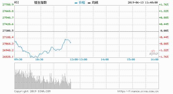港股今早低開90點后跌幅不斷擴大,曾最多急挫483點,半日低見26825點,失守十天線(27138點)。