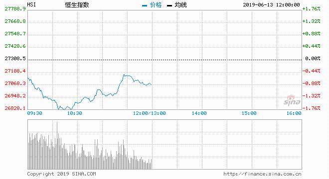 摘要: 6月13日消息,今日早盤,恒指低開(kāi)低走,一度失守27000點(diǎn)。此后,中國(guó)資本市場(chǎng)迎來(lái)歷史性時(shí)刻,科創(chuàng)板今日正式開(kāi)板。恒指受益A股跌幅快速收窄,不過(guò)此后恒指跌幅再度擴(kuò)大。截至午盤,恒指跌0.86%,報(bào)2
