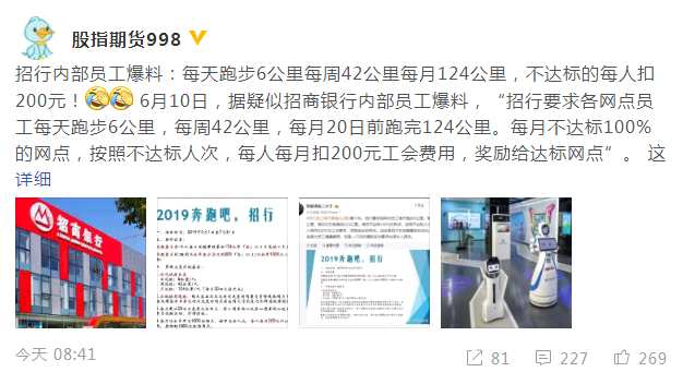 摘要: 近日有知名博主表示,據(jù)疑似招商銀行內(nèi)部員工爆料,招行深圳羅湖龍崗區(qū)要求各網(wǎng)點(diǎn)員工每天跑步6公里,每周42公里,每月20日前跑完124公里。每月不達(dá)標(biāo)100%的網(wǎng)點(diǎn),按照不達(dá)標(biāo)人次,每人每月扣200元工