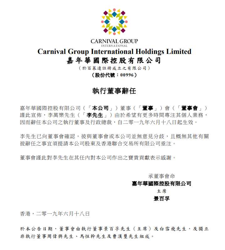 資料顯示,李萬樂于2019年4月4日獲委任為嘉年華國際執(zhí)行董事及行政總裁,至今入職僅兩月有余。