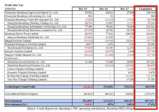 雖然收入匹配,但合并的中國信用報告顯示,波司登嚴重夸大了波司登在其香港交易所申報中所報告的凈利潤:香港交易所的文件披露波司登累計3年凈利潤為人民幣13億元,但合并后的中國信用報告顯示,波司登的子公司僅凈利潤為人民幣4.63億元。