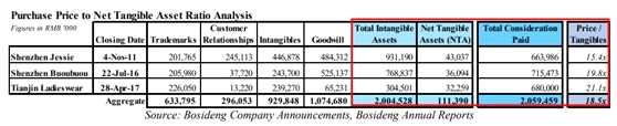 下表突顯了波司登收購中出現(xiàn)的共性:波司登似乎已經(jīng)為周先生收購的企業(yè)支付了人為高價15倍至21倍的凈有形資產(chǎn),其資產(chǎn)為95%無形資產(chǎn),并且慷慨地贈送周先生的三年內(nèi)高達4000%的回報。