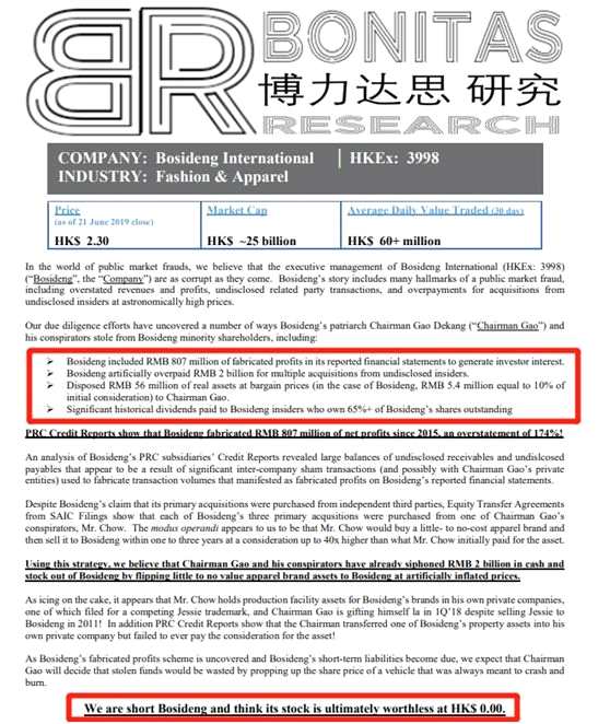 6月24日上午10點,沽空機構(gòu)BONITAS發(fā)表沽空報告,指控波司登在公開市場造假,夸大收入及盈利等,報告指,該股完全沒有價值,給予零元。