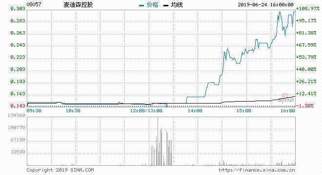 摘要: 麥迪森控股(08057)尾市落鑊,最終全日收升110.34%,報0.305元,收復10天(0.162元)及20天線(0.21元),為升幅最大個股;成交約1.52億股,涉資2452萬元,主動買盤90%。