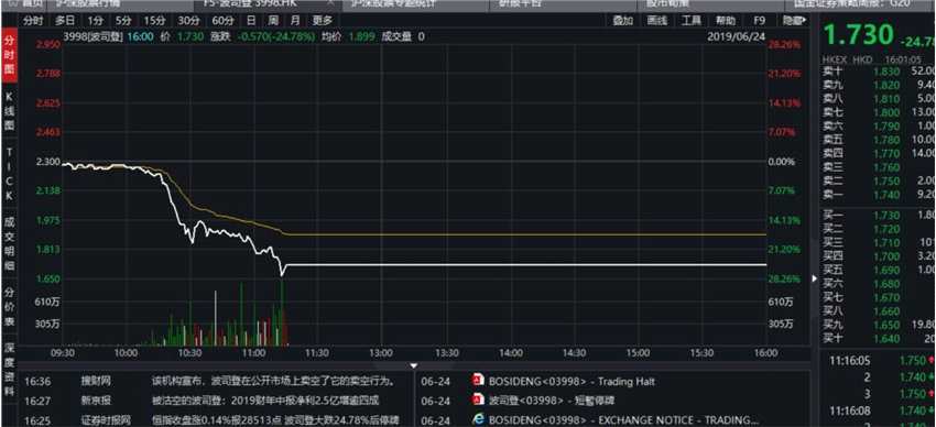 至收盤時(shí),波司登并未復(fù)牌,其股價(jià)報(bào)1.73港元,跌0.57港元或24.783%,成交1.723億股。公司市值由246億港元跌至185億港元,縮水61億港元。