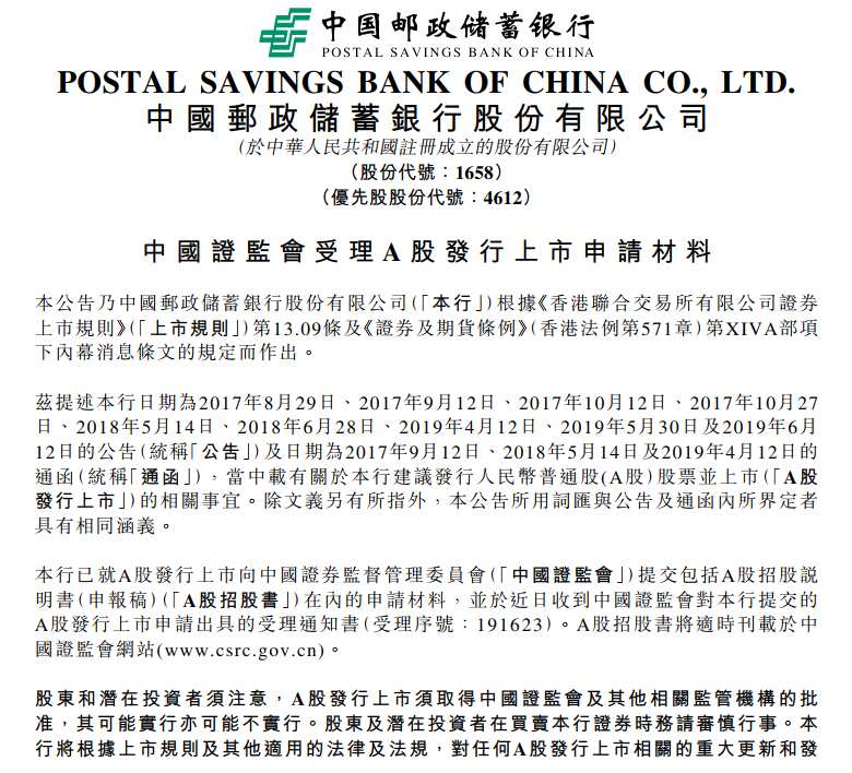 郵儲銀行在港交所公告稱,證監(jiān)會受理公司A股發(fā)行上市申請材料。