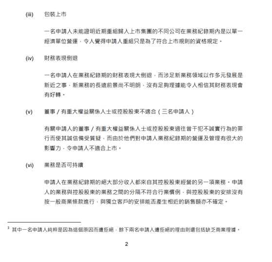 從最近被港交所拒絕上市申請(qǐng)時(shí)引述的最關(guān)鍵的三個(gè)要素主要包括:
