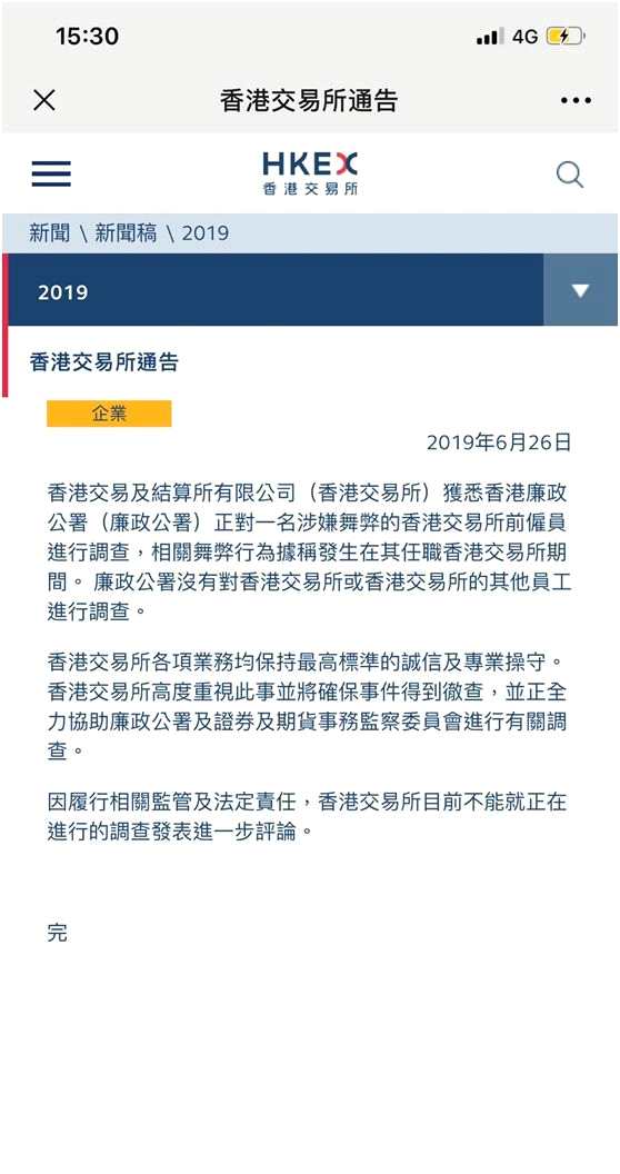 昨日,港交所在聲明中稱,獲悉香港廉政公署正對(duì)一名涉嫌舞弊的港交所前雇員進(jìn)行調(diào)查,相關(guān)舞弊行為發(fā)生在其任職期間,廉政公署沒有對(duì)港交所其他員工進(jìn)行調(diào)查,港交所各項(xiàng)業(yè)務(wù)均保持最高標(biāo)準(zhǔn)的誠信及專業(yè)操守,并高度重視此事件確保得到徹查,并正在全力協(xié)助廉政公署及香港證監(jiān)會(huì)進(jìn)行調(diào)查。