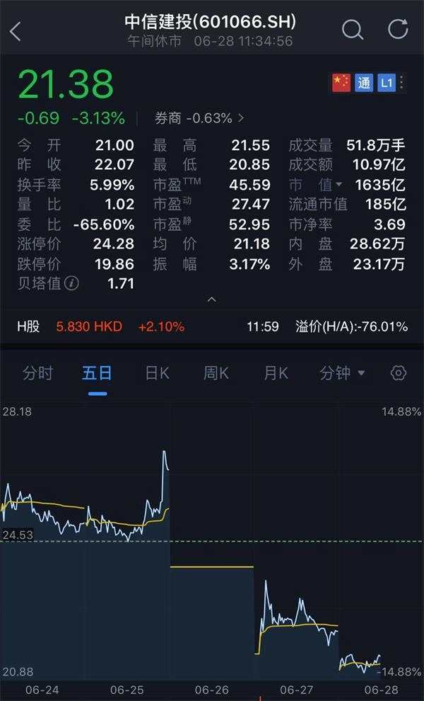 受到清倉(cāng)減持影響,中信建投股價(jià)連續(xù)三天大跌,周三開(kāi)盤(pán)跌停,周二大跌7%,今日上午仍持續(xù)跌勢(shì),截至中午收盤(pán),中信建投A股股價(jià)已經(jīng)跌去了20%,市值蒸發(fā)了差不多300億。