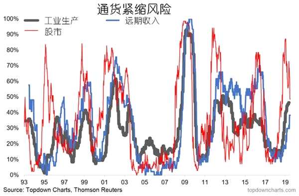 正如Callum Thomas此前所說(shuō),全球80%以上的股票市場(chǎng)都處于“通縮”狀態(tài),這里的風(fēng)險(xiǎn)就是圖中所示的黑色和藍(lán)色的曲線,它們分別代表預(yù)期收益和工業(yè)生產(chǎn)每年萎縮的國(guó)家比例?,F(xiàn)實(shí)可能會(huì)讓所有人都感到有點(diǎn)沮喪,因?yàn)槿蚪?jīng)濟(jì)衰退的風(fēng)險(xiǎn)確實(shí)在增加。