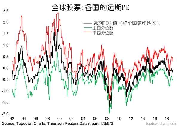 有趣的是,就全球股票估值而言,遠(yuǎn)期市盈率中值仍低于長(zhǎng)期平均水平。半年前,Thomas就表示,在全球股市調(diào)整之后,它變得越來(lái)越容易找到“便宜貨”。估值已經(jīng)重新回到以前的一些主要市場(chǎng)低點(diǎn)。盡管目前全球股票估值并沒(méi)有跌至谷底,但總體上來(lái)看,估值正處于一個(gè)較低水平。