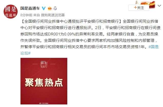 7月6日,全國銀行間同業(yè)拆借中心公開通報稱,2019年7月2日,【平安銀行(000001)、股吧】和招商銀行在銀行間債券回購市場達(dá)成DR001為0.09%的異常利率交易。經(jīng)兩家銀行自查,為交易員操作失誤所致。全國銀行間同業(yè)拆借中心現(xiàn)對平安銀行和招商銀行進(jìn)行通報批評,要求兩家機構(gòu)加強風(fēng)險控制和內(nèi)部管理,并依據(jù)《銀行間本幣市場交易員管理辦法(試行)》(中匯交發(fā)〔2014〕196號),暫停平安銀行和招商銀行相關(guān)交易員的銀行間本幣市場交易員資格1年。
