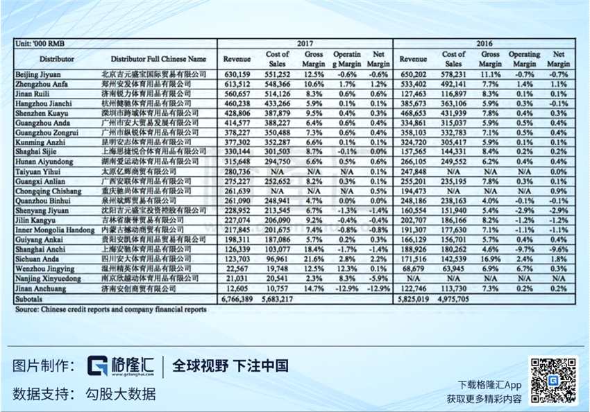 這些分銷商的利潤率,根據(jù)渾水的報(bào)告,非常低,遠(yuǎn)低于百麗旗下運(yùn)動(dòng)部門和寶勝國際。渾水認(rèn)為安踏是把費(fèi)用丟在了這些分銷商體系里,把利潤做進(jìn)了上市公司,因而安踏才有如此靚麗的基本面。