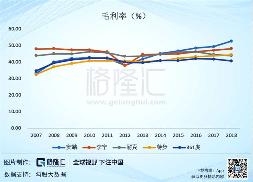 當(dāng)然,更牛逼的,還是安踏與同行比較起來,拿毛利率來說吧,安踏這些年在高端品牌FILA的推動(dòng)下,步步上升,已經(jīng)超過了耐克,不過基本還是一個(gè)量級(jí)的。