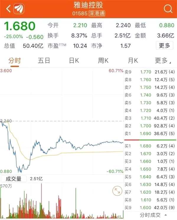 電動兩輪車生產商龍頭雅迪控股(01585.HK)也一度急挫逾6成,低見0.88元,創(chuàng)上市以來新低。截至收盤,公司股價報收1.68港元,跌幅回至25%,市值略有回升,達50.40億港元。全天成交2.51億股,涉資3.66億港元。