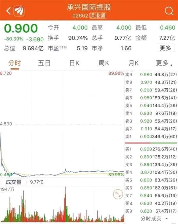 7月8日,承興國際控股(02662.HK)開盤即快速下挫,一度閃崩90%,截至收盤,股價為0.90港元,從前一日4.59港元收盤價直接淪為仙股,全天下跌80.39%,市值從前一日的49億港元縮水至約9.69億港元。