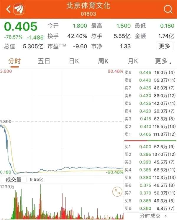 北京體育文化(01803.HK)股價同樣出現閃崩,全天下跌78.57%,公司市值從前一日的逾20億蒸發(fā)到最新的5.305億港元,全天交易總額1.74億港元。值得注意的是,該股最低下跌至0.18港元,創(chuàng)近七年新低。