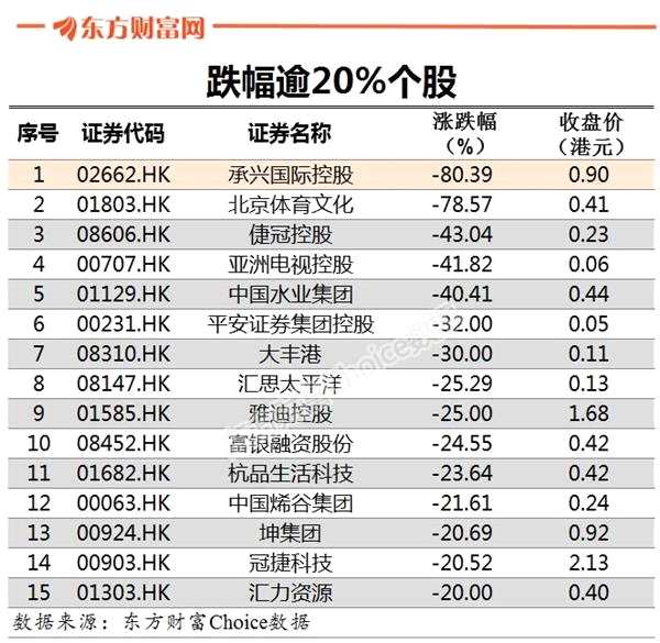 7月8日,港股現個股閃崩潮。細價股集體下挫,多股創(chuàng)歷史新低。截至收盤,跌幅為20%及以上的有15只,幾乎全部為股價低于1港元的“仙股”。其中,承興國際控股、北京體育文化跌幅逾75%。