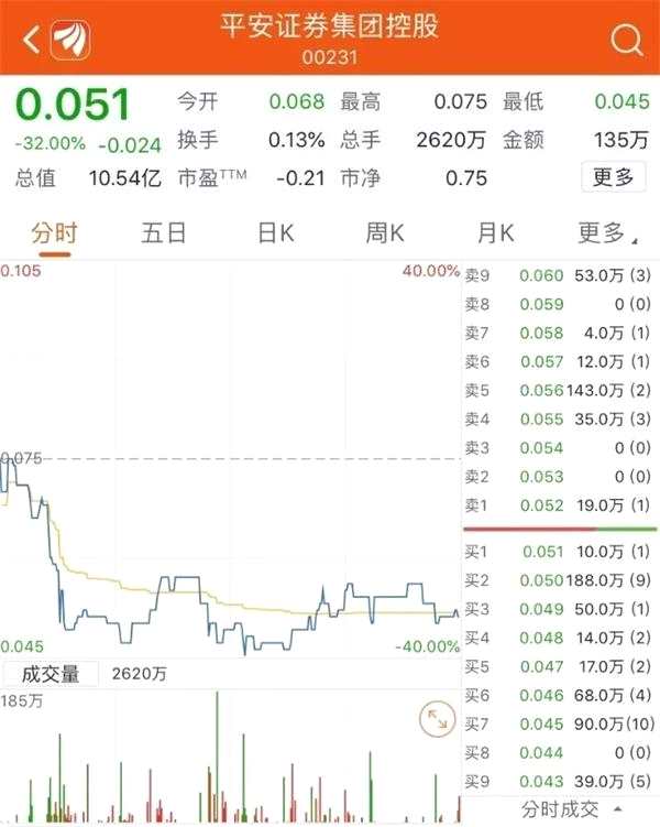 此外,平安證券集團控股(00231.HK)全天下挫32.00%,總市值縮水至10.54億港元。