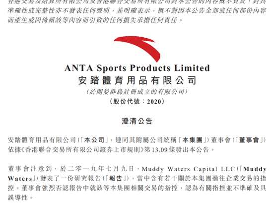 安踏體育反擊渾水第二彈:強烈否認(rèn)渾水指控 具誤導(dǎo)性
