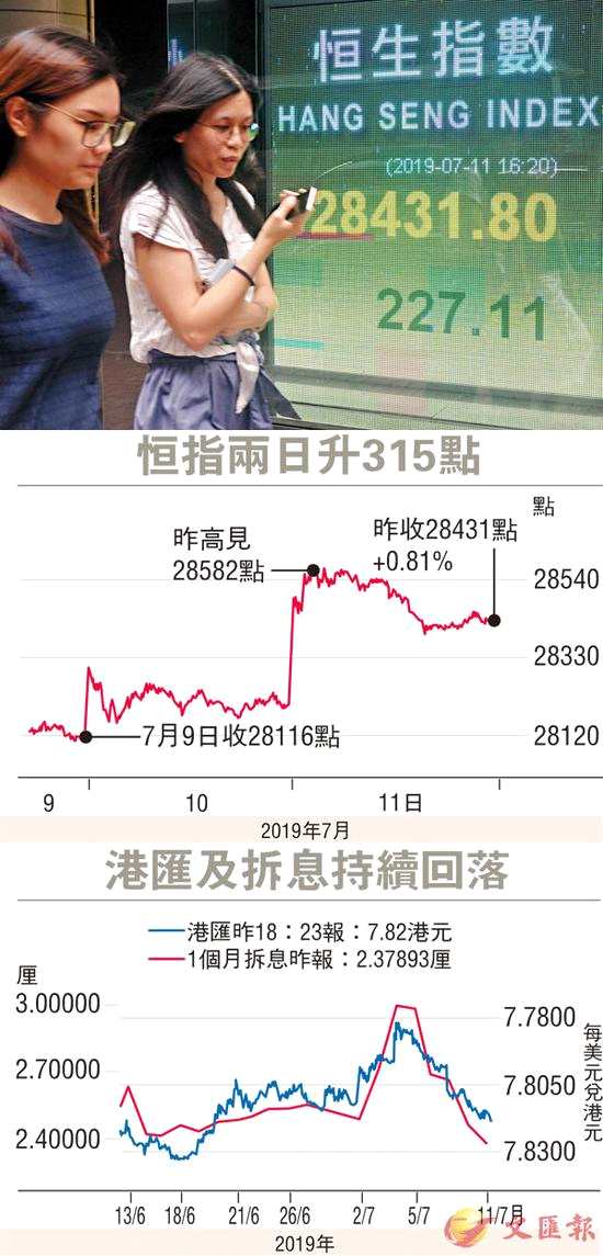 摘要: ■港股昨一度升378點,但成交仍低僅得675億元。中新社貿(mào)戰(zhàn)氣氛緩和港元走弱拆息續(xù)回落據(jù)香港文匯報(記者周紹基)美聯(lián)儲主席鮑威爾出席美國國會作證時,暗示7月底將減息,刺激外圍股市造好,加上貿(mào)易戰(zhàn)氣氛略
