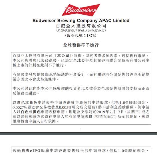 相關(guān)報(bào)道:百威亞太取消上市:申購款項(xiàng)是否都會(huì)退還 你虧多少