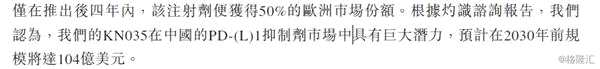 招股書稱,KN035在中國的PD-(L)1抑制劑市場中具有巨大潛力,預(yù)計KN035在2030年前規(guī)模將達104億美元。
