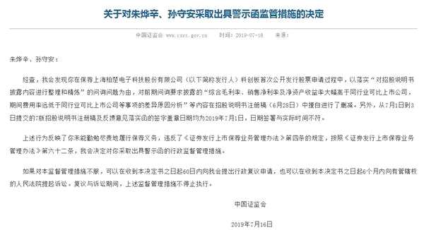 證監(jiān)會(huì)對(duì)柏楚電子也出具了警示函。需要注意的是,柏楚電子的注冊(cè)申請(qǐng)已于7月16日獲證監(jiān)會(huì)通過(guò)。