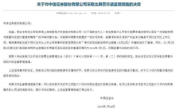 7月16日,證監(jiān)會(huì)官網(wǎng)公告稱,中信證券因擅自修改招股書(shū)被出具警示函。證監(jiān)會(huì)認(rèn)為中信證券內(nèi)部控制制度存在薄弱環(huán)節(jié),要求整改;兩位保薦代表人朱燁辛、孫守安,發(fā)行人柏楚電子也被采取了出具警示函的行政監(jiān)督管理措施。