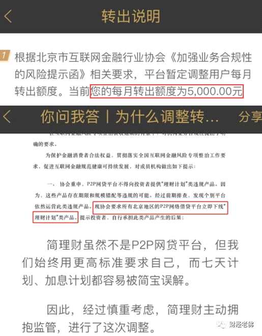 簡(jiǎn)理財(cái)在去年7月30日發(fā)布公告,宣布限制提現(xiàn),每月最多轉(zhuǎn)出可轉(zhuǎn)金額的5%,最高不超過(guò)5000元,如果你投資10萬(wàn)元,需要近兩年才能提完。