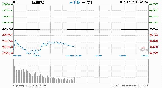 7月18日消息,美股周三收跌,道指下跌逾110點(diǎn)。財報與經(jīng)濟(jì)數(shù)據(jù)好壞參半。投資者同時還在關(guān)注貿(mào)易關(guān)系及美聯(lián)儲貨幣政策前景。美聯(lián)儲褐皮書認(rèn)為整體經(jīng)濟(jì)活動增速緩和。今日開盤,港股恒指低開0.7%,隨后在28440點(diǎn)上下波動。截至午間收盤,恒生指數(shù)跌0.49%,報28453.57點(diǎn);國企指數(shù)跌0.42%,報10802.60點(diǎn)。紅籌指數(shù)跌0.44%,報4427.92點(diǎn)。