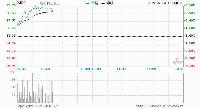 ASM【太平洋(601099)、股吧】(601099)(00522)日內(nèi)將公布中期業(yè)績(jī),現(xiàn)急漲4.39%,報(bào)89.1元,盤(pán)中高見(jiàn)89.5元,創(chuàng)逾兩個(gè)月高位,主動(dòng)買盤(pán)71%;成交約47萬(wàn)股,涉資4091萬(wàn)元。