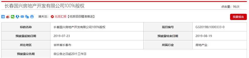 7月23日,根據(jù)北京產(chǎn)權(quán)交易所消息,保利發(fā)展(HK:600048))掛牌長(zhǎng)春國興房地產(chǎn)開發(fā)有限公司(簡(jiǎn)稱“長(zhǎng)春國興”)100%股權(quán),預(yù)披露結(jié)束日期為8月19日,目前標(biāo)的轉(zhuǎn)讓底價(jià)等條款尚未公布。