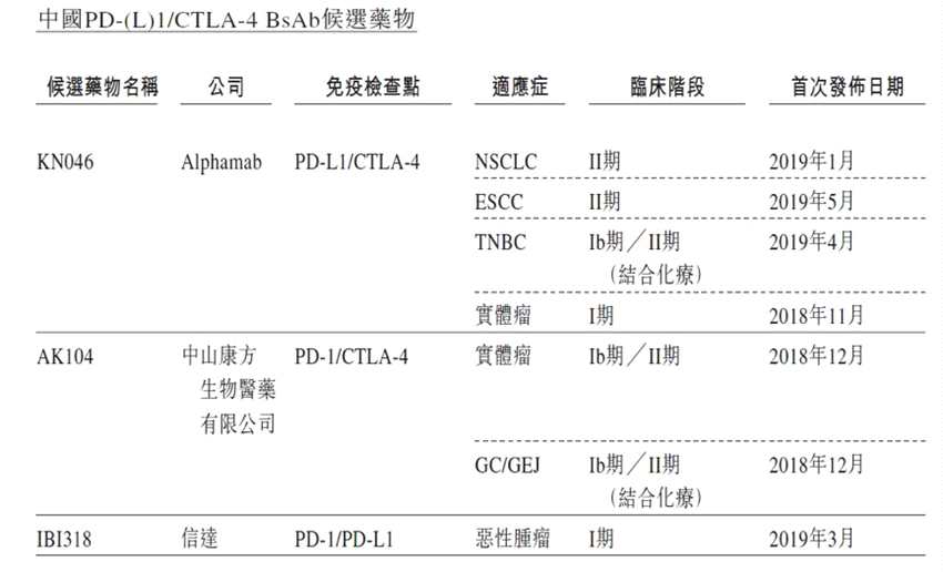 以KN046產(chǎn)品為例,截至2019年5月底,中國已有三種靶向兩個(gè)不同的免疫檢查點(diǎn)的BsAb(雙特異性單克隆抗體)候選藥物,包括康方生物的AK104以及信達(dá)生物的IBI318。